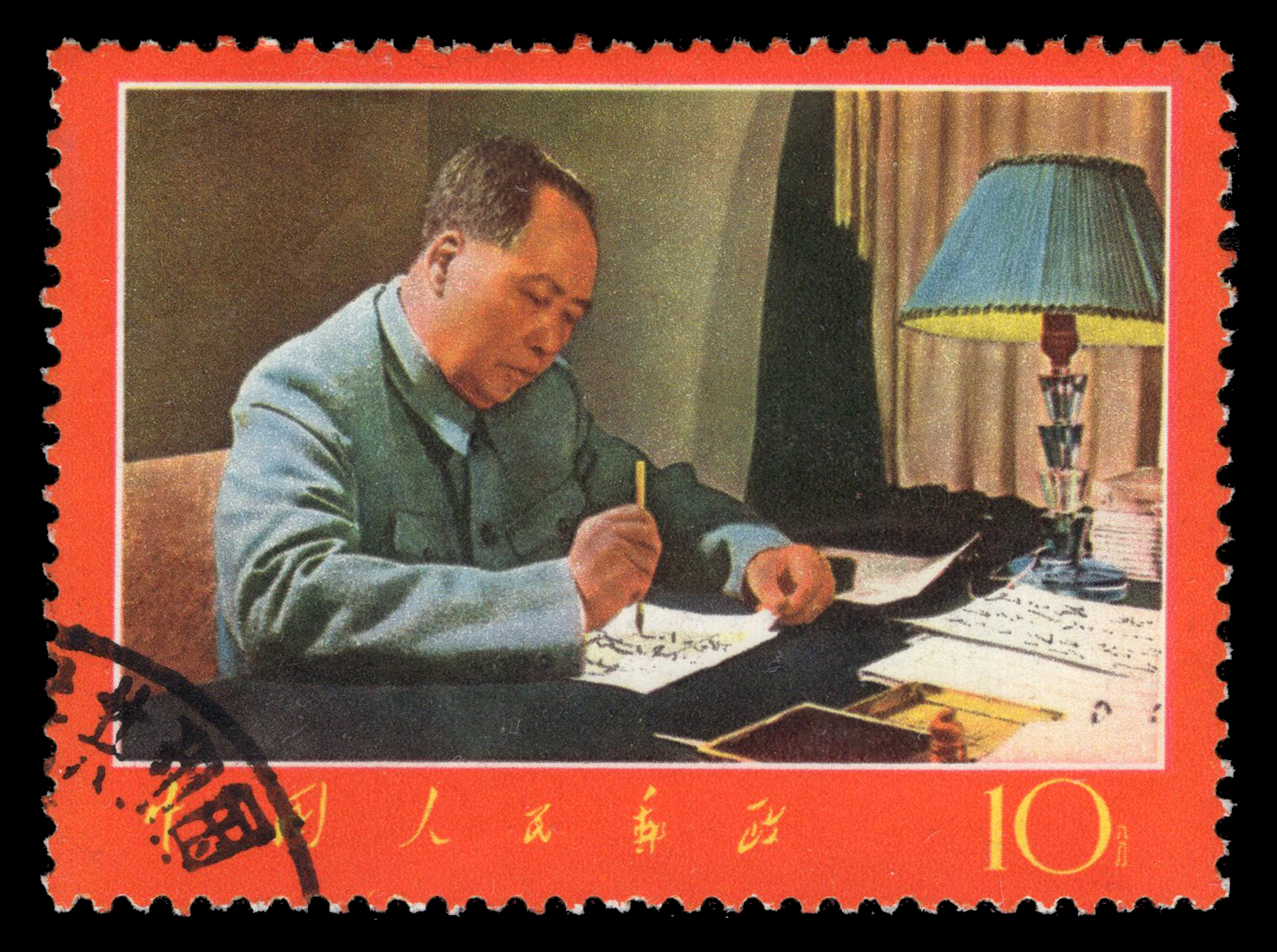 Chinesische Briefmarke 8 Fen "Mao am Schreibtisch, Gedichte verfassend" aus dem Briefmarkensatz "Maos Gedichte" aus dem Jahr 1967, Rastertiefdruck, Kammzähnung 11, gestempelt