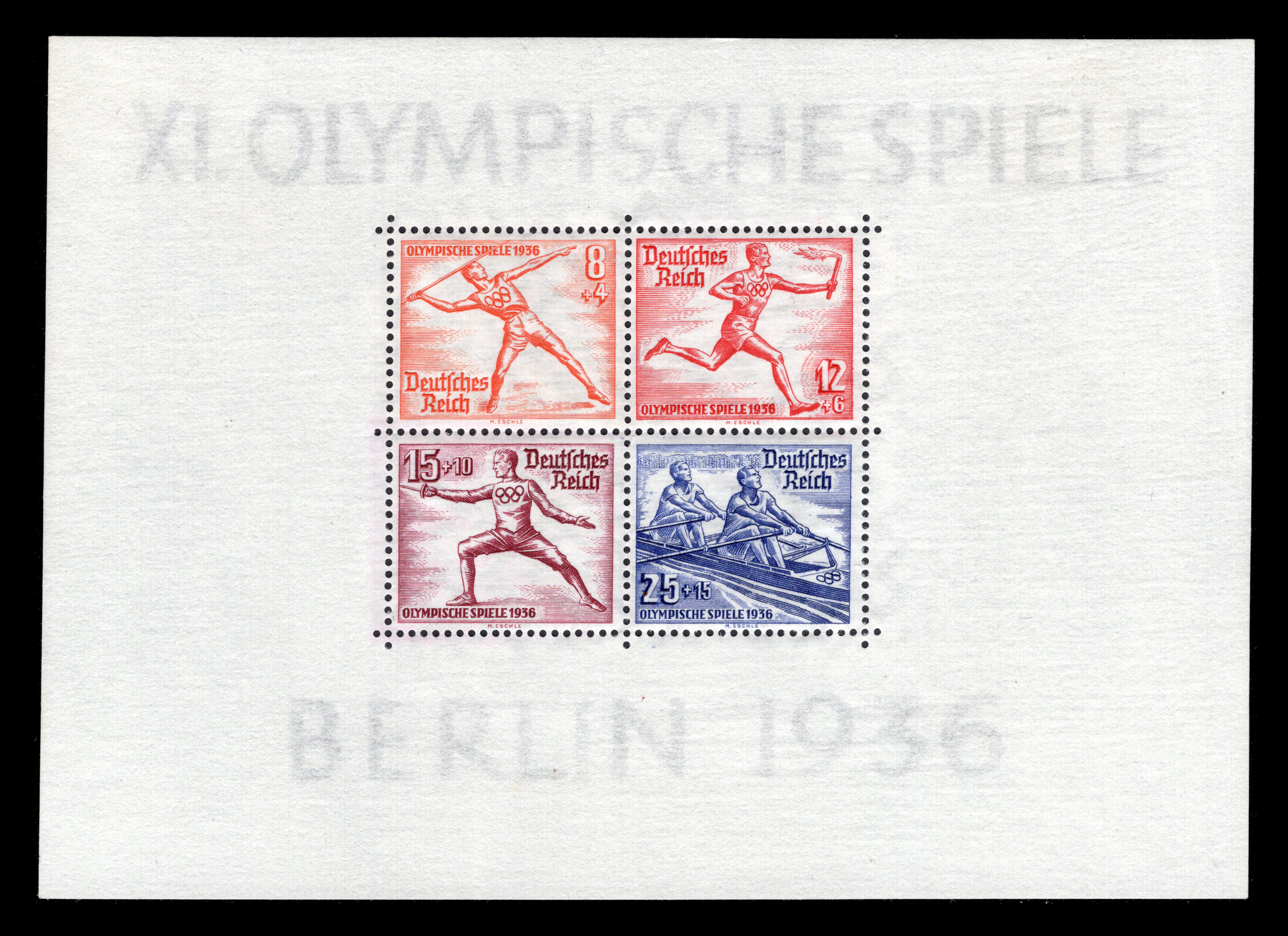 Deutscher Briefmarkenblock "Olympische Sommerspiele" aus der Zeit des Deutschen Reiches 1936 mit den Briefmarken Michel Nummer 612, 613, 614 und 615, Kammzähnung 14, postfrisch