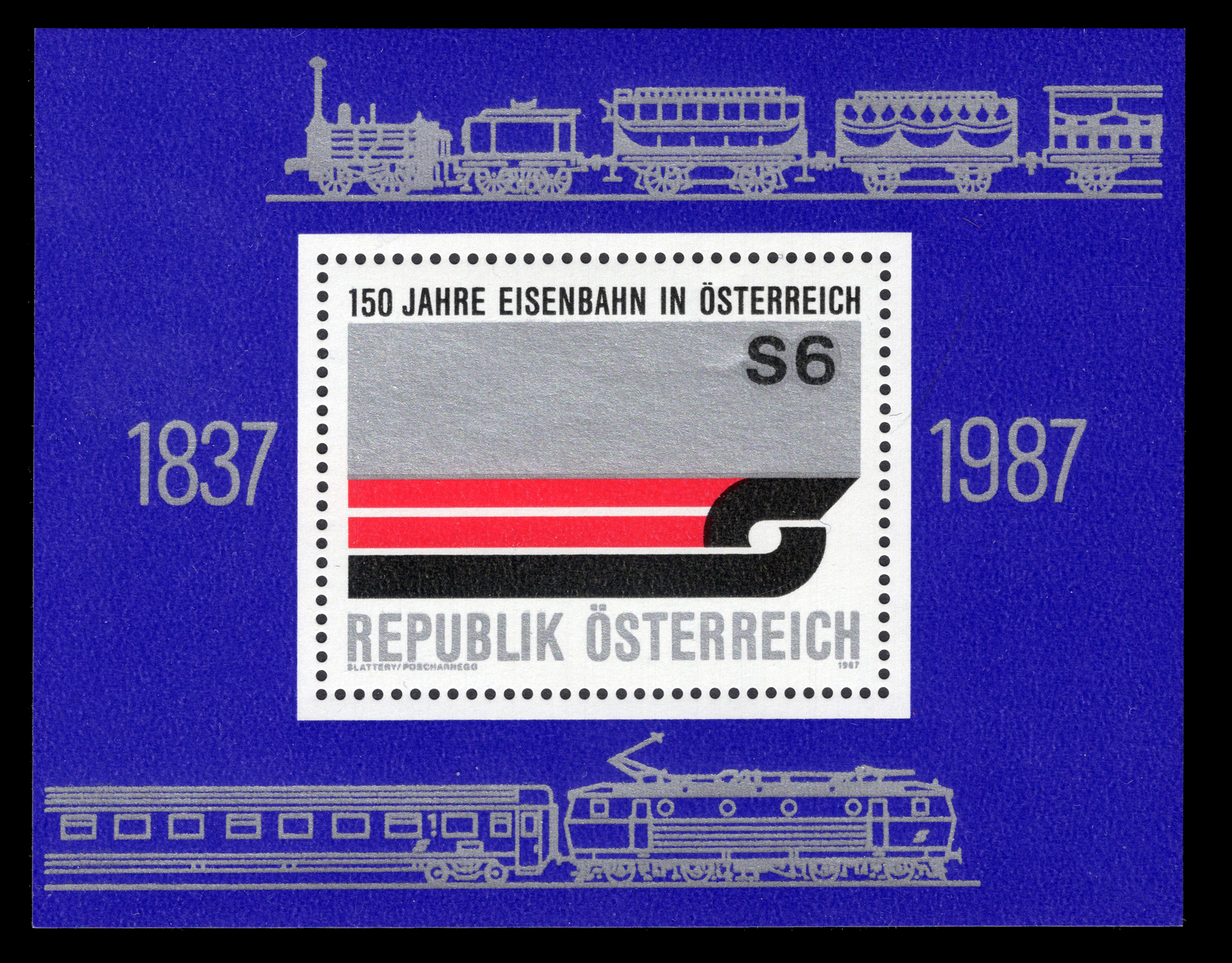 Österreichischer Briefmarkenblock "150 Jahre Eisenbahn in Österreich" aus dem Jahr 1987, Rastertiefdruck, Kammzähnung 13¾ : 13½, postfrisch