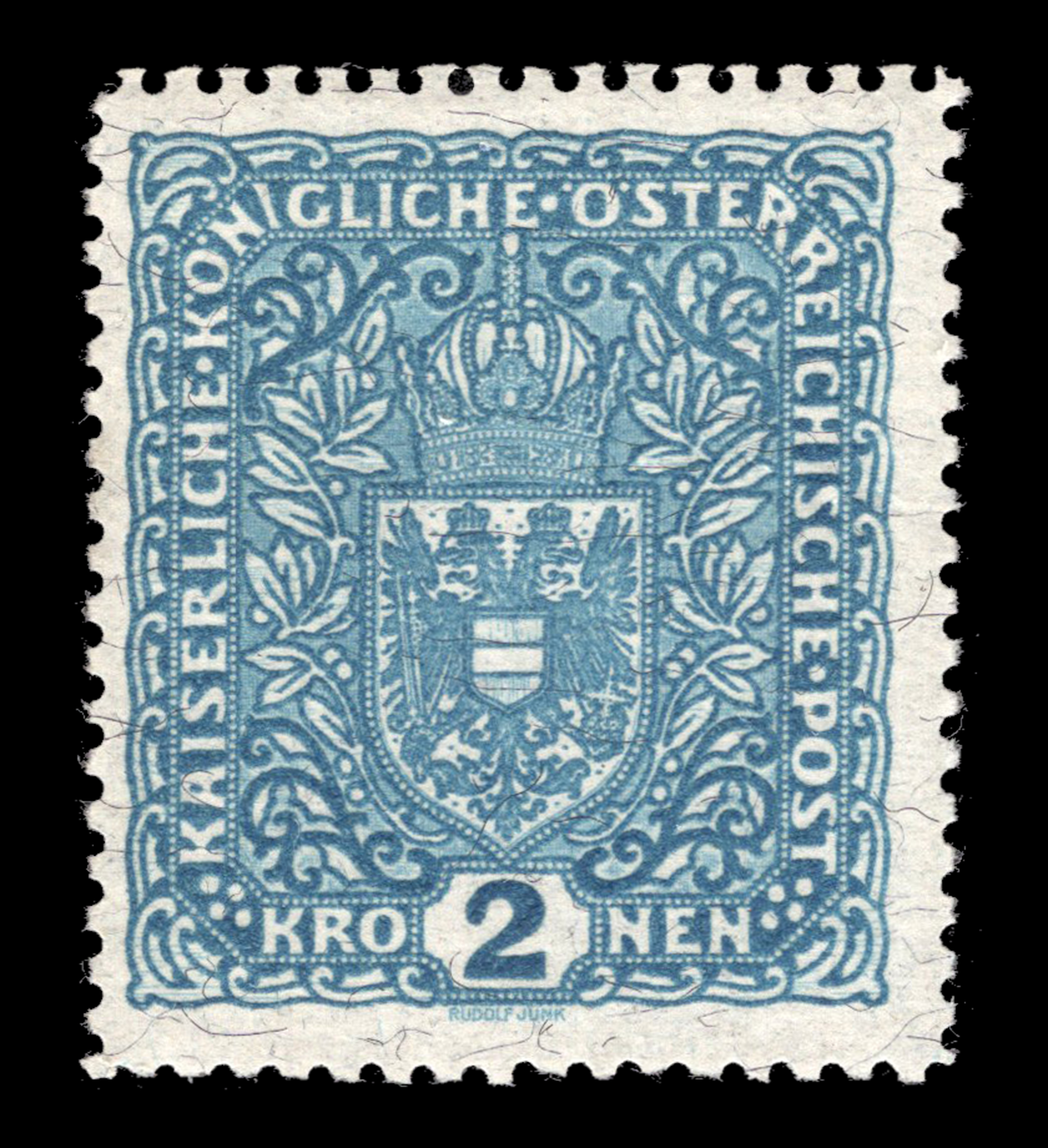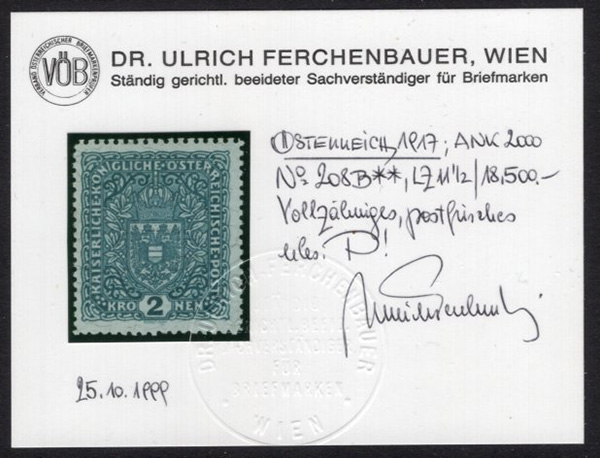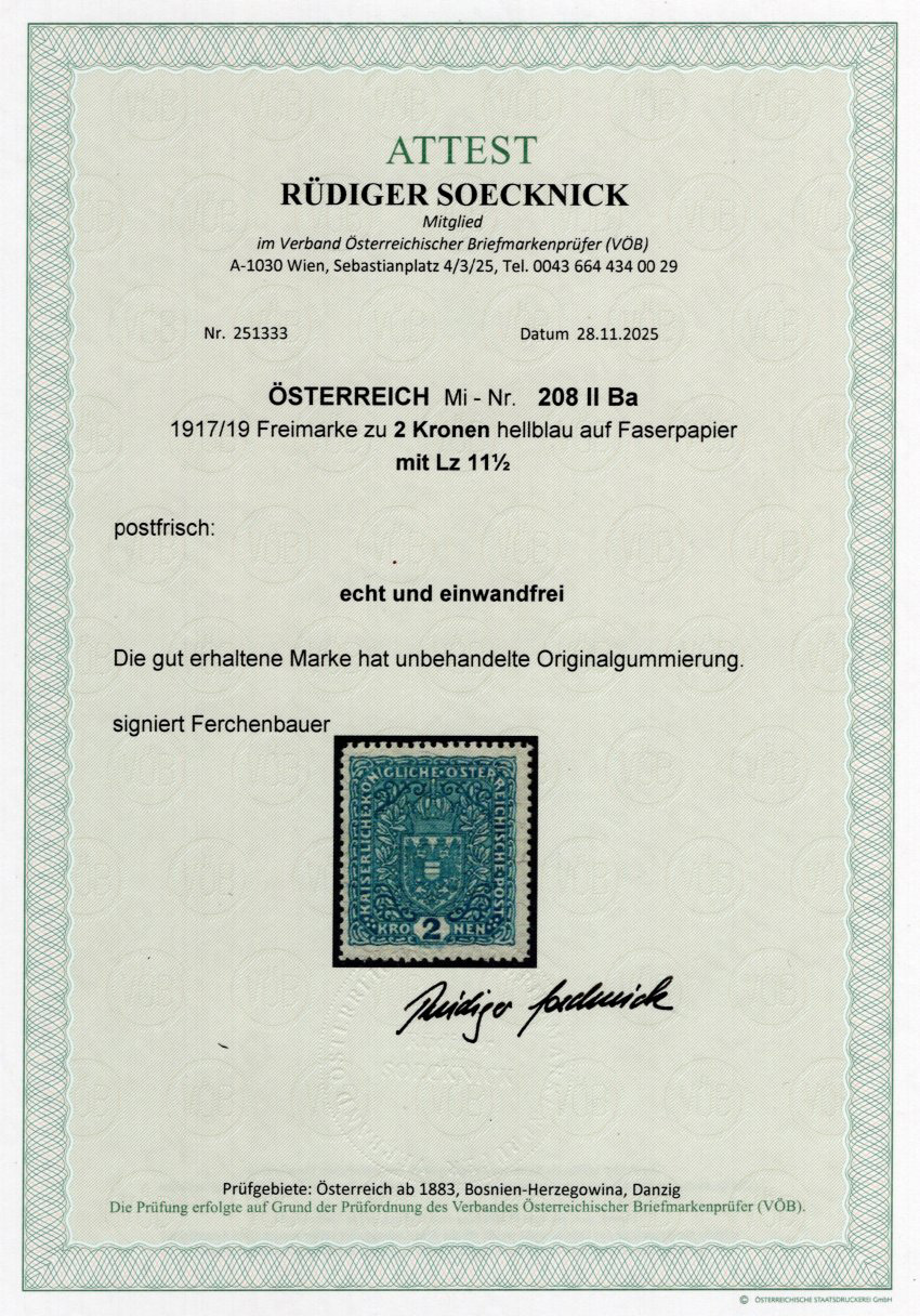Austrian stamp 2 Kronen from the series Coat of arms design on fibre paper in wide format and with the rare line perforation 11½, postage stamp issue, 1917/1919, mint and certified