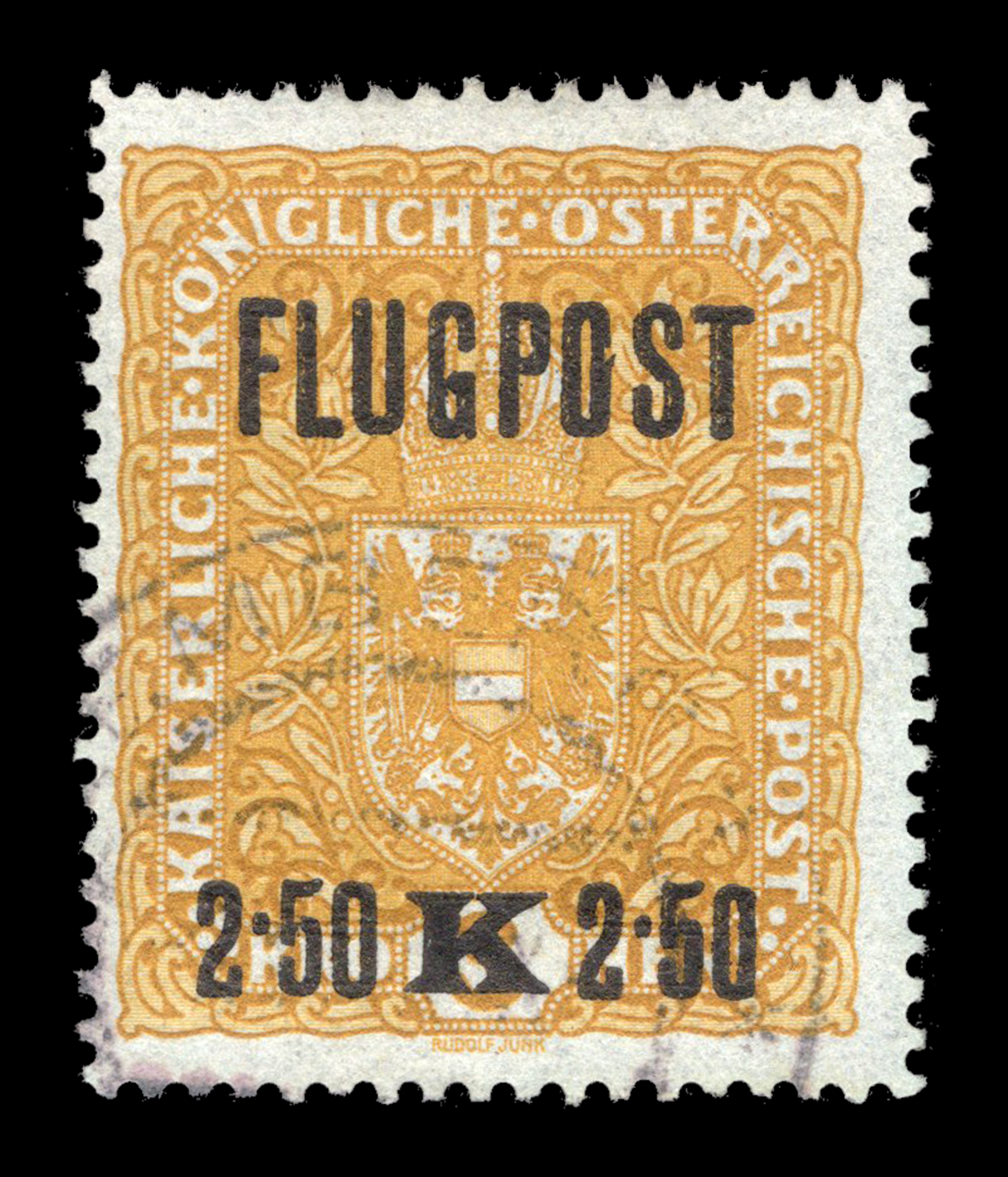 Austrian stamp 2.50 crowns from the stamp set "Airmail stamps for the Vienna-Krakow-Lviv-Kiev route" with the plate error "notch in the O" from 1918. Colour change of previous crown values with overprint FLUGPOST or value overprint, intaglio printing, line perforation 12½, used