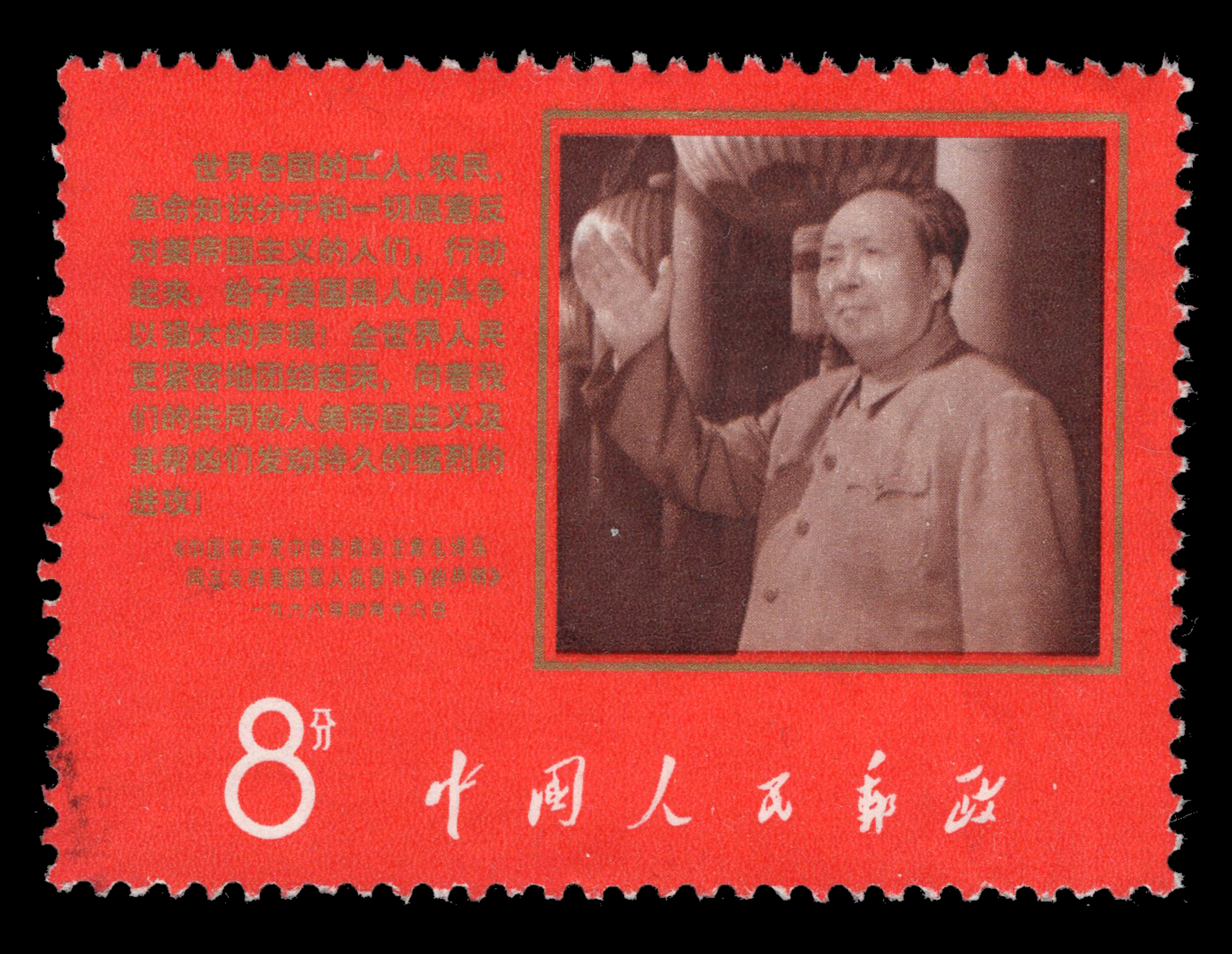 Chinese stamp "Mao's Instructions to the Central Committee of the Communist Party of China (Aid to African Americans)" from 1968, there is a faint postmark in the lower left corner, intaglio printing, comb perforation 11, cancelled